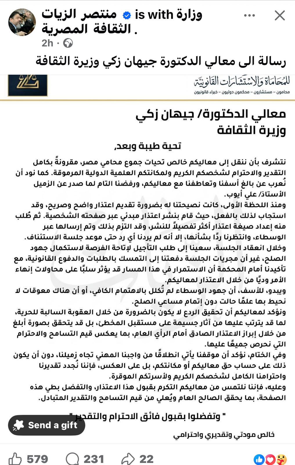 شهدت الساحة القانونية والثقافية في مصر تطورا في قضية السب والقذف المنظورة أمام القضاء، والمتهم فيها المحامي علي أيوب بالإساءة إلى وزيرة الثقافة الدكتورة جيهان زكي. وفي محاولة لإنهاء النزاع ودياً، وجه المحامي منتصر الزيات خطاباً مفتوحاً إلى الوزيرة، يحمل اعتذارا صريحا بالنيابة عن موكله.