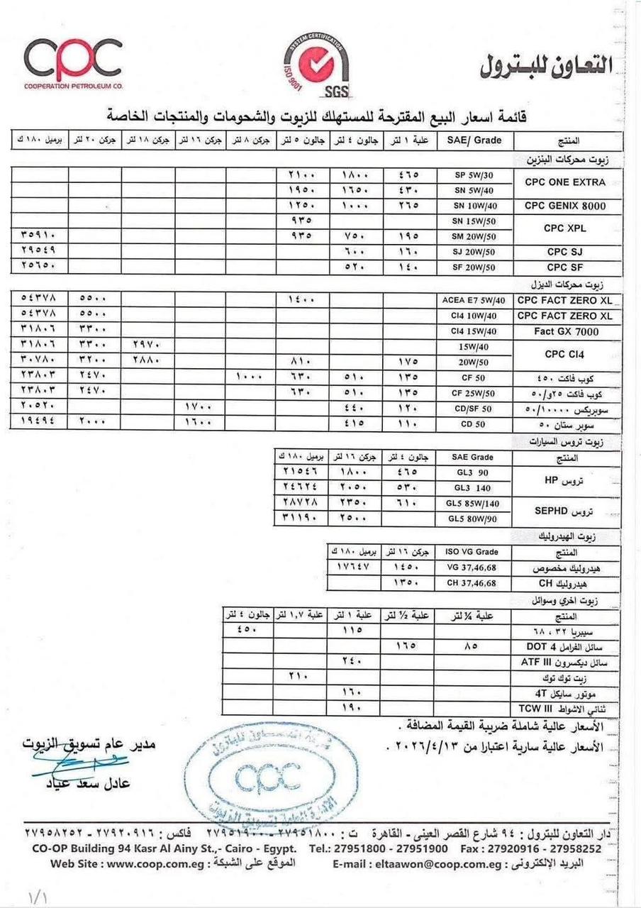 وجاءت أبرز زيادات زيوت السيارات كالتالي: زيوت التعاون (CPC): ارتفع سعر زيت CPC ONE EXTRA (5 لتر) إلى 2100 جنيه، و CPC GENIX 8000 إلى 1250 جنيهًا.