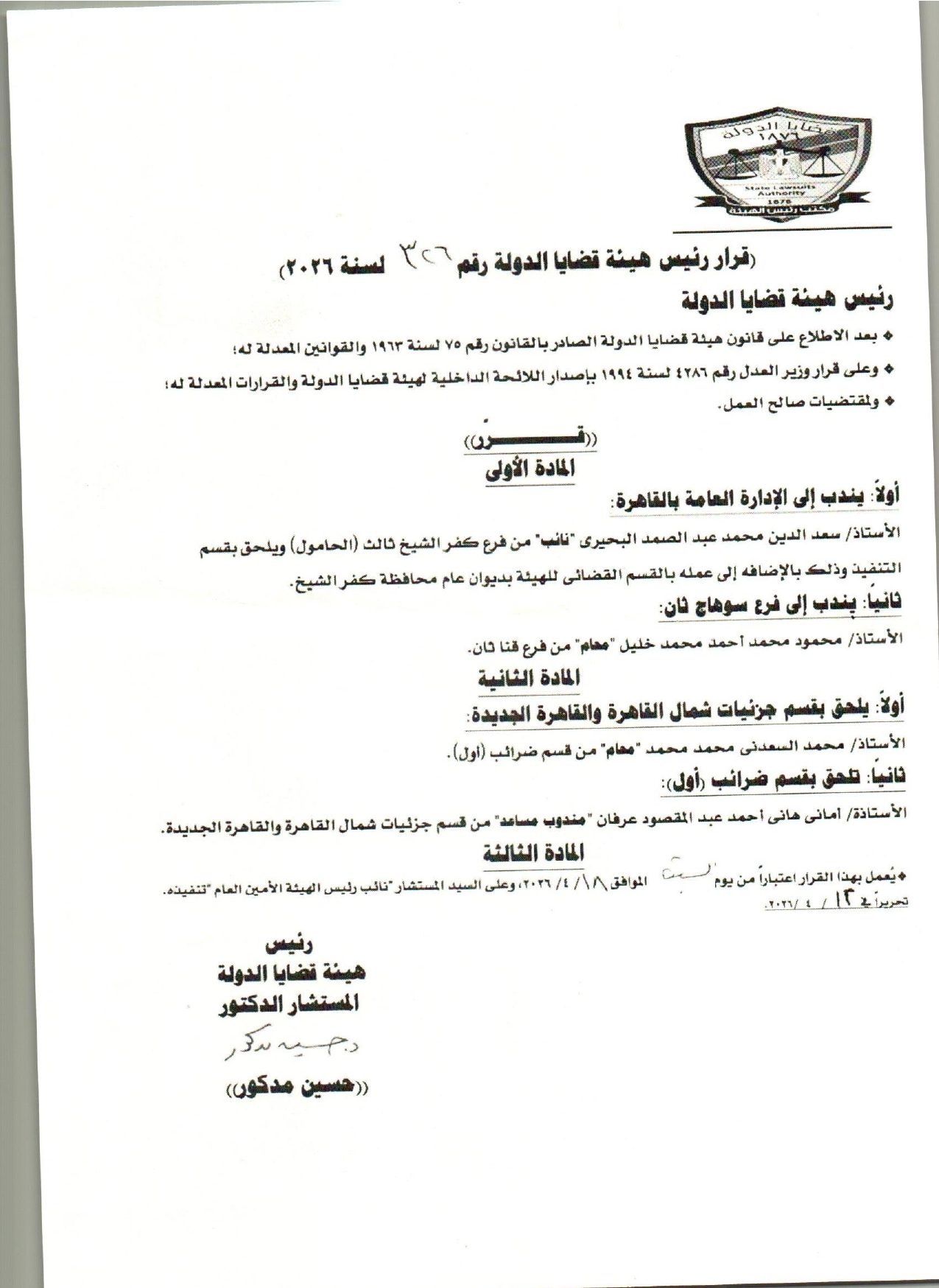 أصدر المستشار الدكتور حسين مدكور، رئيس هيئة قضايا الدولة، القرار رقم 326 لسنة 2026، بندب نائب من فرع كفر الشيخ ثالث بالحامول وإلحاقه بقسم التنفيذ، وبندب محام من فرع قنا ثان إلى فرع سوهاج ثان، وإلحاق محام بقسم بقسم جزئيات شمال القاهرة والقاهرة الجديدة، وإلحاق مندوب مساعد بقسم ضرائب أول.