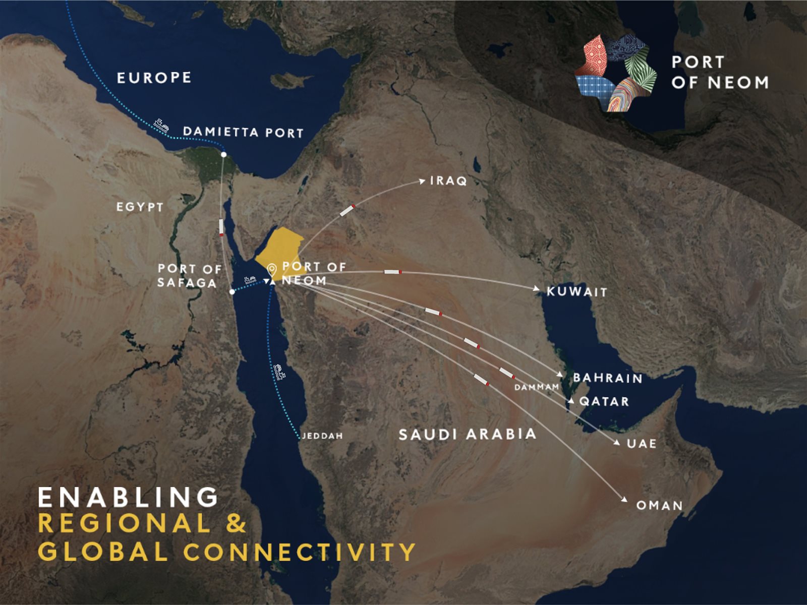 حيث تتطلع "نيوم" السعودية لأن تكون حلقة الربط في مسار جديد يتضمن، أوروبا – مصر–نيوم – دول مجلس التعاون الخليجي.