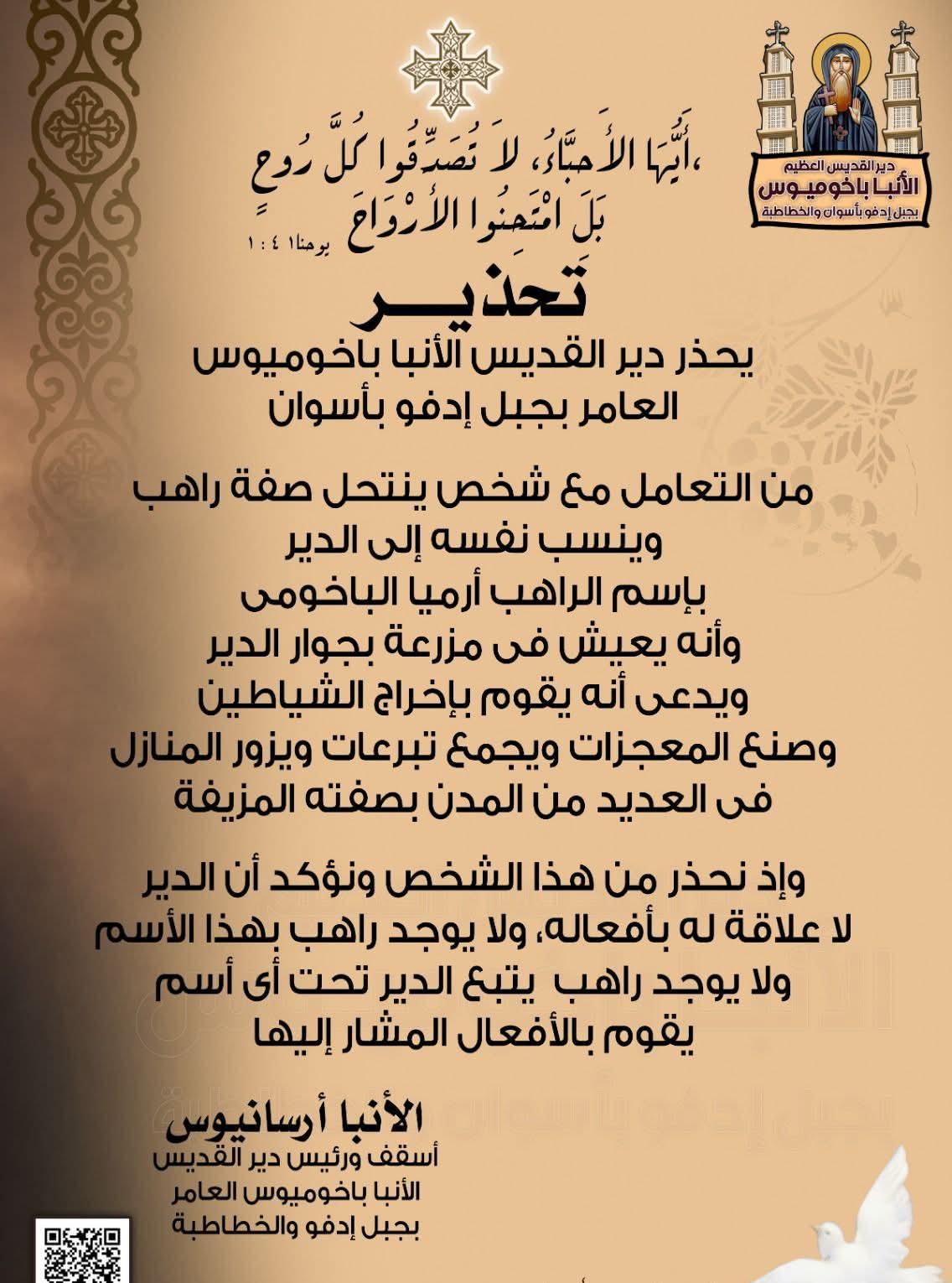 وأصدر دير القديس الأنبا باخوميوس (بجبل إدفو في أسوان والخطاطبة) تحذيراً من التعامل مع شخص ينتحل صفة راهب، وينسب نفسه إلى الدير باسم "الراهب أرميا الباخومي". وأوضح الدير أن هذا الشخص يقطن في مزرعة بجوار الدير، ويدعي قيامه بإخراج الشياطين وصنع المعجزات، كما يقوم بجمع التبرعات وزيارة المنازل في مدن عديدة بصفته المزيفة.
