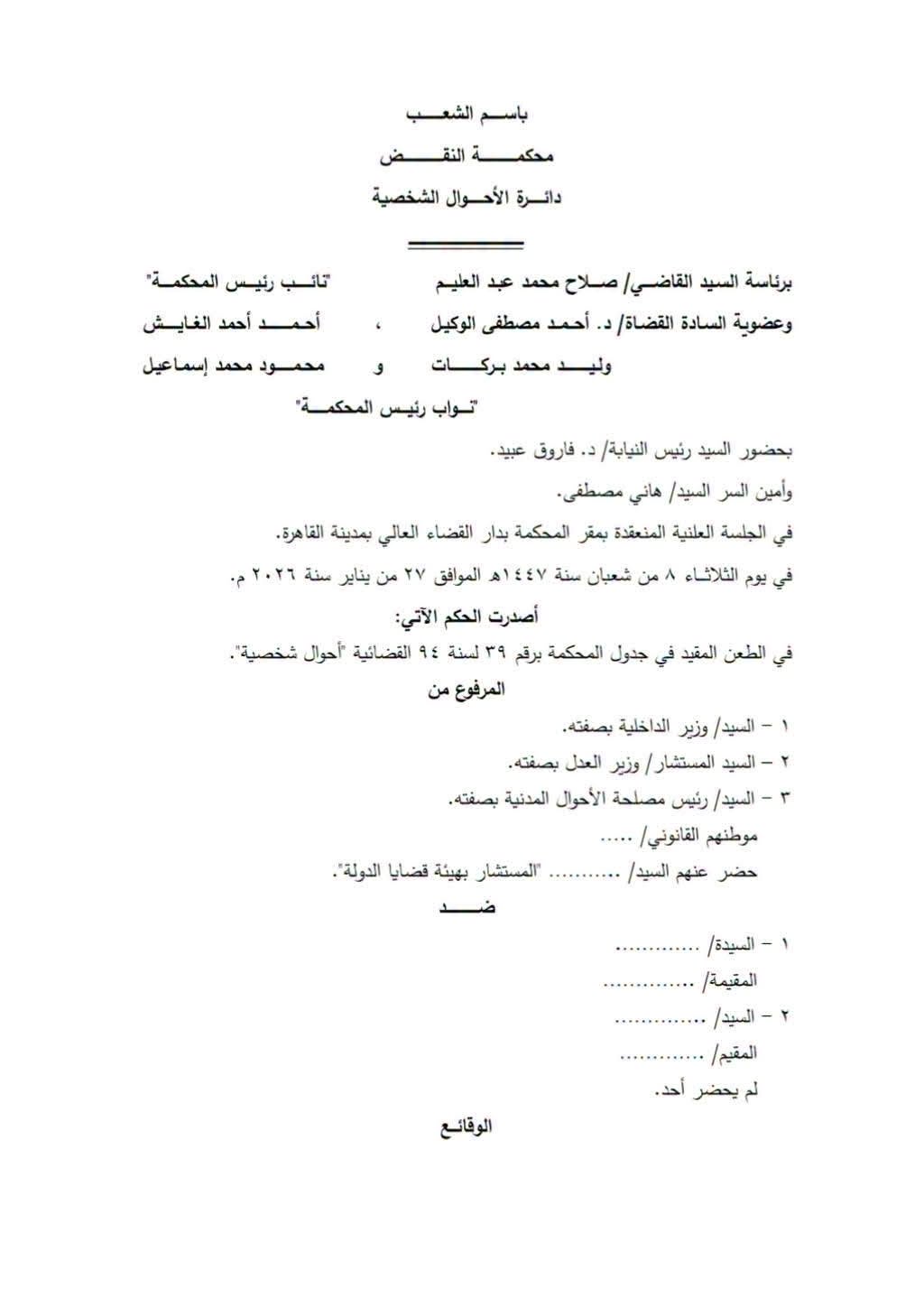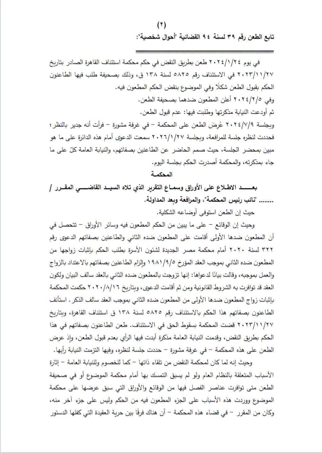 وتعود تفاصيل القضية إلى دعوى أقامتها سيدة أمام محكمة أسرة مصر الجديدة عام 2020، طالبت فيها بإثبات زواجها من شخص بموجب عقد يعود إلى عام 1981. وكانت محكمة أول درجة قد حكمت لصالحها بإثبات الزواج، قبل أن يتم الطعن على الحكم من جانب جهات رسمية، من بينها وزارات وجهات مختصة بالأحوال المدنية.