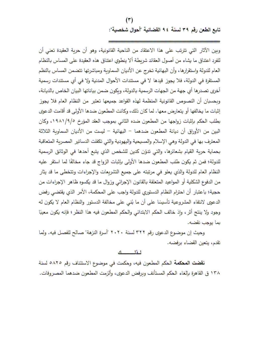 واختتمت المحكمة حيثياتها بالتأكيد على أن أي عقد يترتب على ما يخالف النظام العام لا يُعتد به قانونًا، حتى وإن وُجد ماديًا، مشددة على أن مثل هذه العقود لا تنتج أي أثر قانوني داخل الدولة، ما دام مرتبطًا بعقيدة غير معترف بها رسميًا في الوثائق المدنية.