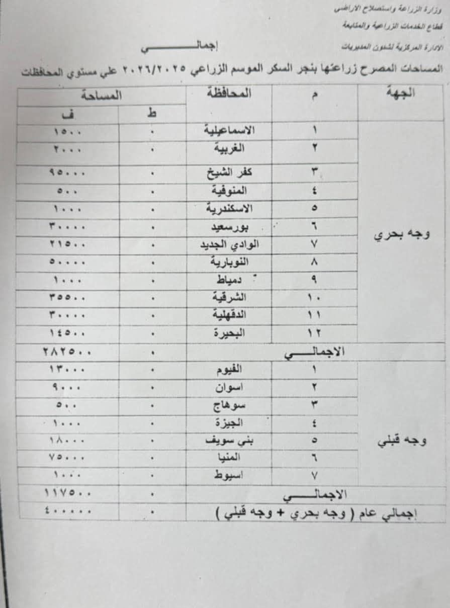 وقبل بداية الموسم حددت الوزارة مساحات ومناطق زراعة بنجر السكر لموسم 2025 – 2026، وكشفت البيانات الرسمية عن استهداف زراعة مساحة إجمالية من بنجر السكر تصل إلى 400 ألف فدان على مستوى محافظات الجمهورية. تأتي هذه الخطوة في إطار سعي الدولة لتعزيز الإنتاج المحلي من السكر وتقليل الفجوة الاستيرادية، معتمدة في ذلك على توزيع المساحات المنزرعة بين أقاليم مصر المختلفة لضمان توريد منتظم للمصانع طوال موسم الحصاد.