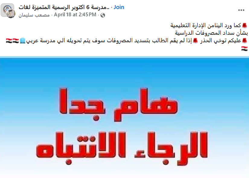 وأصدرت المدارس الرسمية لغات، تنبيها عاجلا للطلاب غير المسددين لـ المصروفات الدراسية 2026، وذلك عبر على صفحاتها الرسمية على موقع فيسبوك، وقالت فيه: "بناءً على تعليمات وزارة التربية والتعليم، يرجى الالتزام بسرعة سداد المصروفات الدراسية المتأخرة، وذلك لتجنب الإجراءات القانونية الصارمة التي سيتم اتخاذها.