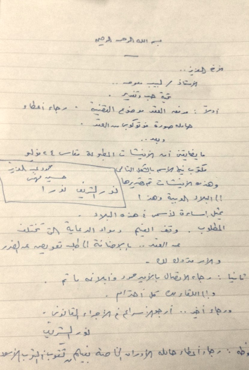 وبعد، فما يضايقني أن الأفيشات المطبوعة مقاس 24 فوليو، مكتوب فيها الاسم بالشكل التالي -رسم نور الشريف ترتيب الأسماء على الأفيش- وهذه الأفيشات تم تصديرها للبلاد العربية، وهذا يمثل إساءة لاسمي في هذه البلاد. المطلوب.. وقف الفيلم ومواد الدعاية التي تختلف عن العقد، بالإضافة إلى طلب تعويض عن الضرر، والأمر متروك لك. ثانياً: رجاء الاتصال بالأمير محمود، وإبلاغه بما تم، وإلى اللقاء ولك كل الاحترام. ورجاء أخير.. أرجو الإسراع في الإجراء القانوني، وإعطاء حامله الأوراق الخاصة بفيلم ثقوب في الثوب الأسود".