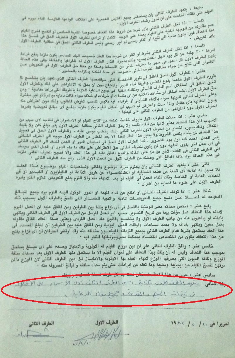 يؤكد ذلك صورة من خطاب نور الشريف لمحاميه الخاص، القانوني الكبير الراحل لبيب معوض، والذي جاء به: "الأخ العزيز الأستاذ لبيب معوض، تحية حب وتقدير أولاً: مرفق العقد موضوع القضية، رجاء إعطاء حامله صورة فوتوكوبي من العقد.