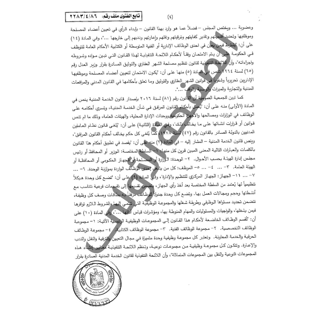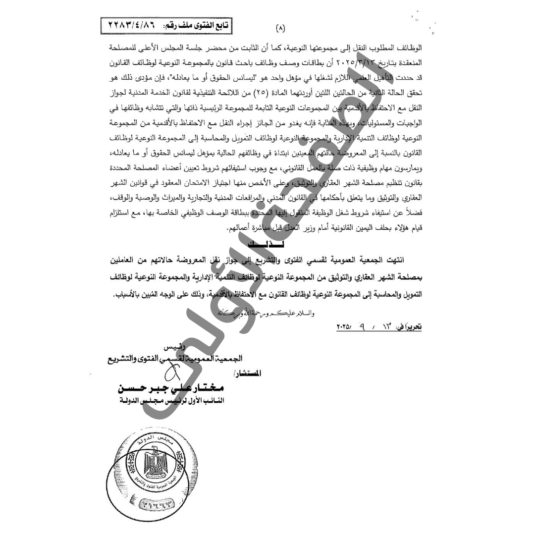 وتم عرض الأمر على المجلس الأعلى للمصلحة حيث انتهى بأغلبية الآراء إلى عدم الموافقة على نقل المعروضة حالتهم من المجموعة النوعية لوظائف التنمية الإدارية إلى المجموعة النوعية لوظائف القانون، ثم أعيد استطلاع رأي الجهاز المركزي للتنظيم والإدارة بشأن الموضوع ذاته والذي أفاد بموجب كتاب رئيس الجهاز رقم (۷۵۲۱۷۹) المؤرخ ٢٠٢٥/٢/٤ بتأكيده على رأيه السابق بالموافقة من حيث المبدأ على نقل المعروضة حالتهم إلى وظائف القانون مع احتفاظهم بالأقدمية في ضوء استيفاء شرط التأهيل العلمي اللازم لشغل الوظيفة المنقول إليها وكذا في ضوء حالة العجز بالوظائف المنقولين إليها، ومن ثم تم عرض أمر إجراء النقل من شاغلي المجموعة النوعية لوظائف التنمية الإدارية وشاغلي المجموعة النوعية لوظائف التمويل والمحاسبة إلى المجموعة النوعية لوظائف القانون على المجلس الأعلى للمصلحة في جلسته المنعقدة بتاريخ ۲۰۲۵/۳/۱۳ حيث انتهى إلى : أولاً : الموافقة على قبول طلبات النقل من المجموعة النوعية لوظائف التنمية الإدارية إلى وظائف القانون مع احتفاظهم بأقدميتهم مسايرة لرأي الجهاز المركزي للتنظيم والإدارة وذلك للعجز الشديد في العمالة القانونية بالمصلحة، ثانيا : الموافقة على جواز النقل من المجموعة النوعية لوظائف التمويل والمحاسبة مع الاحتفاظ بالأقدمية إلى وظائف القانون قياسًا على موافقة الجهاز المركزي للتنظيم والإدارة المشار إليها وللعجز الشديد في العمالة القانونية بالمصلحة بذات الضوابط الواردة بالبند أولاً. وبعرض الأوراق على السلطة المختصة للنظر في أمر اعتماد رأي المجلس الأعلى للمصلحة، فقد ثار الخلاف في الرأي بشأن مدى جواز النقل من المجموعة النوعية لوظائف التنمية الإدارية والمجموعة النوعية لوظائف التمويل والمحاسبة إلى المجموعة النوعية لوظائف القانون بالمصلحة، ومدى جواز احتفاظ المنقولين بأقدميتهم في ضوء الطبيعة القانونية لعمل الأعضاء الفنيين بالمصلحة، مع التأكيد على بعض المحددات التي يتعين توافرها في الحالات المعروضة وهو أن يكون التعيين في الوظيفة الحالية قد تم بالمؤهل الملائم لشغل الوظيفة المطلوب النقل إلى مجموعتها النوعية، وهو درجة ليسانس الحقوق أو ما يعادله، وأن تكون طبيعة الوظيفة التي يشغلها حاليًا المتقدم بطلب النقل ذات أعباء وظيفية مماثلة للوظيفة المطلوب النقل إليها وذات صلة بالعمل القانوني، وقد بلغ عدد الحالات المعروضة (١١٦) حالة من شاغلي المجموعة النوعية لوظائف التنمية الإدارية والمجموعة النوعية لوظائف التمويل والمحاسبة موزعين على عدد (۲۲) مكتب من مكاتب المصلحة أولهم شيماء السيد عبد الحميد بمكتب شبين الكوم وآخرهم جيهان عيد عودة حسين بمكتب محافظة جنوب سيناء، والذين أفادت المصلحة أن أغلبهم حاصلون على درجة الليسانس في الحقوق أو ما يعادله وقد تم التعيين بهذا المؤهل ابتداء ، وأن أغلبهم يمارسون مهام وظيفية ذات صلة بالقانون والتي تماثل الوظائف المطلوب النقل إلى مجموعتها النوعية، لذا فقد طلبتم استطلاع رأي الجمعية العمومية في الموضوع. ونفيد أن الموضوع عُرض على الجمعية العمومية لقسمي الفتوى والتشريع بجلستها المعقودة في ١٠ من سبتمبر عام ٢٠٢٥م، الموافق ١٨ من ربيع الأول عام ١٤٤٧هـ ؛ فتبين لها أن الدستور ينص في المادة ۱۹۹على أن: "الخبراء القضائيون، وخبراء الطب الشرعي، والأعضاء الفنيون بالشهر العقاري، مستقلون في أ أداء عملهم، ويتمتعون بالضمانات والحماية اللازمة لتأدية أعمالهم على النحو الذي ينظمه القانون"، وأن القانون رقم (۲۱۰) لسنة ١٩٥١ بشأن نظام موظفي الدولة - في النطاق الزمني لسريان أحكامه - كان ينص في الباب الأول منه تحت عنوان "الموظفون الداخلون في الهيئة في المادة (۲) على أن : "تنقسم الوظائف الداخلة في الهيئة إلى فئتين عالية ومتوسطة. وتنقسم كل من هاتين الفئتين إلى نوعين : فني وإداري للأولى. وفني وكتابي للثانية ...". وفي المادة (۱۱) على أن: "المؤهلات العلمية التي يجب أن يكون المرشح حاصلا عل