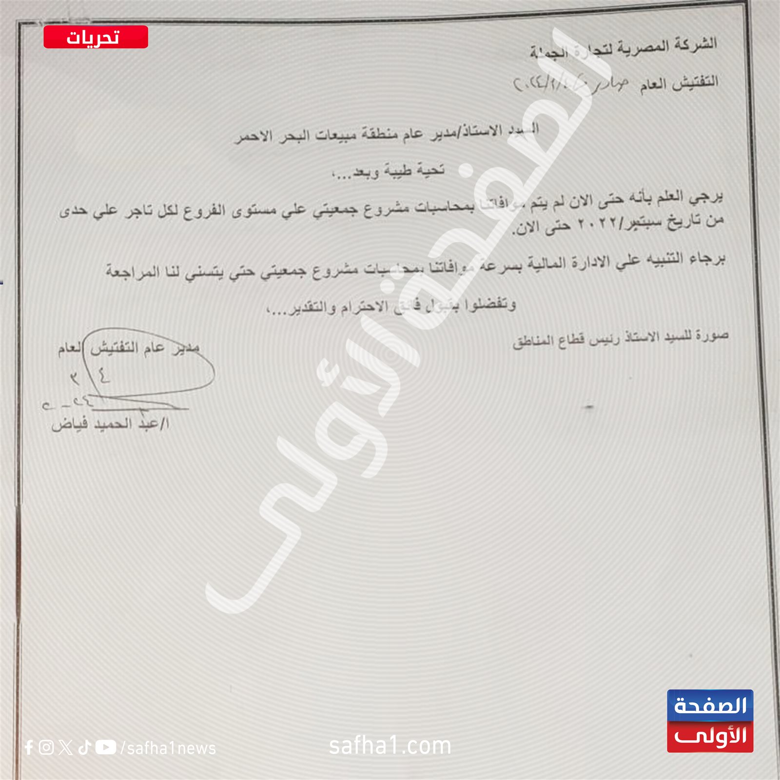 وأكدت 4 خطابات موجهة من إدارة التفتيش العام بالشركة المصرية لتجارة الجملة، إلى مناطق مبيعات بنى سويف والوادي الجديد وأسوان والبحر الأحمر - حصل موقع «الصفحة الأولى» على نسخة منها -، على تقاعس المسئولين عن مشروع جمعيتى بهذه المناطق عن تقديم المستندات الخاصة بالمحاسبات منذ سبتمبر 2022، وهو ما يشير إلى حالات صرف بأزيد من النسب المقررة للتجار.