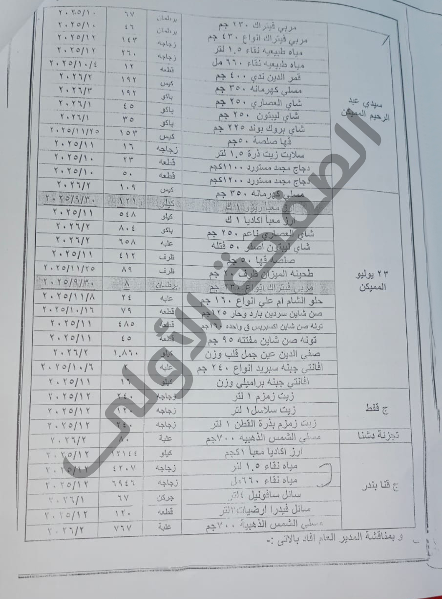 وأشار إلى أنه تم جرد فروع الجملة و الثلاجة جرداً شاملاً وكذلك خزينة الادارة وتم تسليم الجرد للادارة المالية للمراجعة النهائية وقد أسفر الجرد عن المطابقة المبدئية لكافه الفروع فيما عدا وجود بعض الفروع بها عجز و زيادة بالاصناف . كما تم جرد الفروع المميكنة، وأسفر الجرد عن وجود عجز ببعض اصناف السلع الحرة ببعض الفروع .