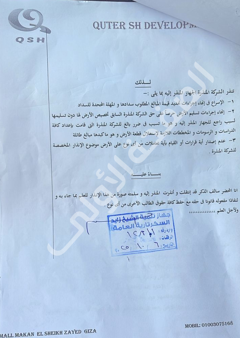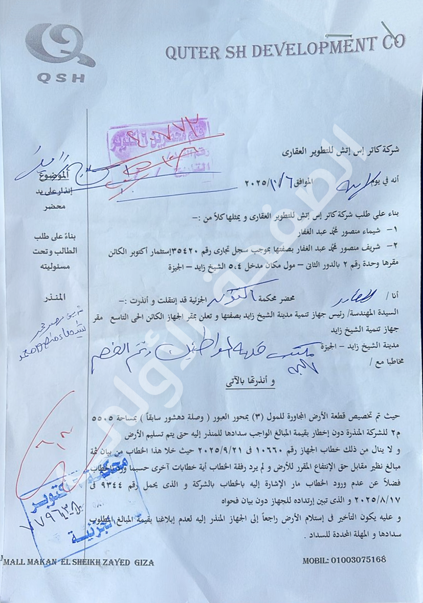 الامر لم يقتصر فقط على مذكرة مرفوعة الى مكتب وزير الإسكان وإنما تطور لتبادل الإنذارات الرسمية على يد محضرفقد أرسلت الشركة إنذاراً على يد محضر، بتاريخ 6 أكتوبر 2025، موجهاً لرئيسة جهاز مدينة الشيخ زايد، المهندسة مروة حسين أمين تنذرها فيه بضرورة الإسراع في انهاء اجراءات تحديد قيمة المبالغ المطلوب سدادها، وإنهاء اجراءات تسليم قطعة الأرض، وعدم إصدار أية قرارات أو القيام بأية تعاملات من اي نوع على قطعة الأرض موضوع الانذار، والمخصصة للشركة المنذرة.