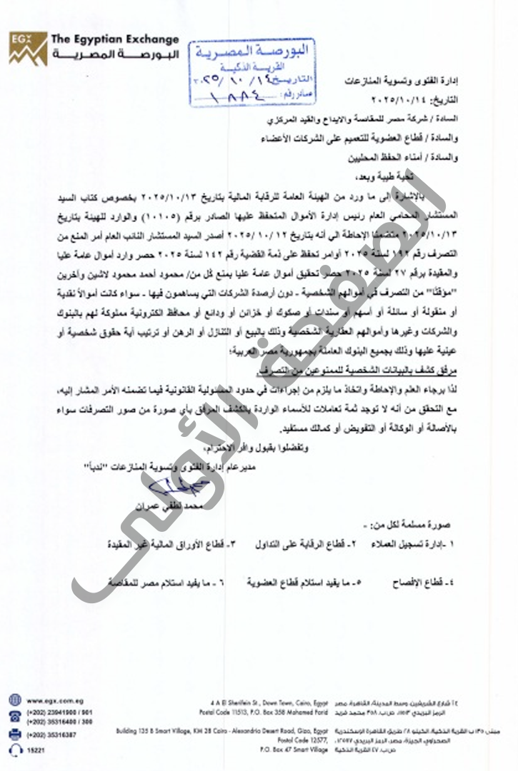 وجاء القرار الصادر بناءا على توصية من إدارة الفتوى وتسوية المنازعات، فى البورصة المصرية تحت رقم 1884 إلى شركة مصر للمقاصة والابداع والقيد المركزي وقطاع العضوية للتعميم على الشركات الأعضاء وأمناء الحفظ المحليين: بالإشارة إلى ما ورد من الهيئة العامة للرقابة المالية بتاريخ 13 /10/ 2025 بخصوص كتاب المستشار المحامي العام رئيس إدارة الأموال المتحفظ عليها الصادر برقم 10105 والوارد للهيئة بتاريخ 13 /10/ 2025 متضمنا الإحاطة الي أنه أصدر المستشار النائب العام أمر المنع من التصرف رقم 192 لسنة 2025 أوامر تحفظ على ذمة القضية رقم 142 لسنة 2025 حصر وارد أموال عامة عليا والمقيدة برقم 27 لسنة 2025 حصر تحقيق أموال عامة عليا يمنع كل من محمود أحمد محمود لاشين وآخرين "مؤقتا" من التصرف في أموالهم الشخصية - دون أرصدة الشركات التي يساهمون فيها - سواء كانت أموالاً نقدية أو منقولة أو سائلة أو أسهم أو سندات أو صكوك أو خزائن أو ودائع أو محافظ الكترونية مملوكة لهم بالبنوك والشركات وغيرها وأموالهم العقارية الشخصية وذلك بالبيع أو التنازل أو الرهن أو ترتيب آية حقوق شخصية أو عينية عليها وذلك بجميع البنوك العاملة بجمهورية مصر العربية مرفق كشف بالبيانات الشخصية للممنوعين من التصرف