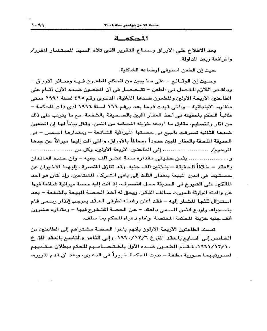 وقالت محكمة النقض في أسباب حكمها، إنه ثبت من تقرير الخبير وسائر الأوراق أن الحصة الشائعة قد انتقلت للمطعون ضده الأول عن طريق الميراث عن والدته، وأن أصل الملكية للمورث قد نزع جزء منها وبِيعت ثم استردت بمقتضى بيعة سنة 1933، ولكن تسجيل عقد البيع لم يتم إلا في تاريخ 12 يناير 1989، وبالتالي فإن الشفيع لم يكن مالكًا وقت إبرام العقد المشفوع فيه بتاريخ 4 ديسمبر 1976.