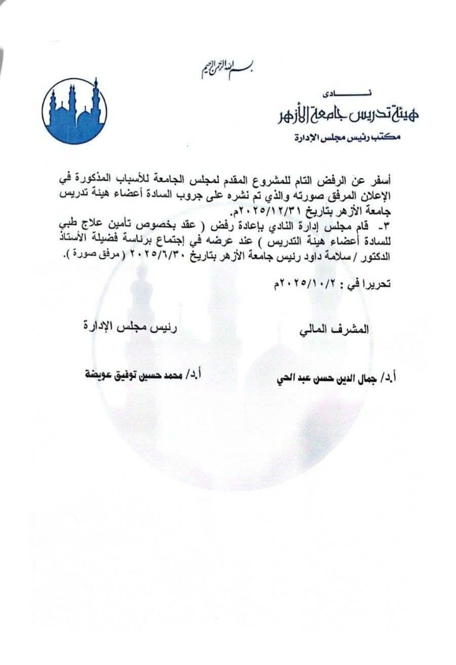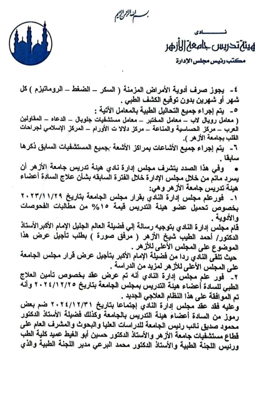 وكشفت مصادر من جامعة الأزهر أن الجامعة قامت بإلغاء كافة المستشفيات غير الجامعية كـ «السلام الدولي، دار الفؤاد، والمقاولون العرب»، واقتصار مشروع العلاج على مستشفيات الجامعة: «الحسين، سيد جلال، والزهراء» إضافة إلى جلوبال ميديكال، مؤكدة أن معمل التحليل الوحيد المتاح لأعضاء التدريس هو المختبر وإلغاء كافة معامل التحاليل الأخرى.