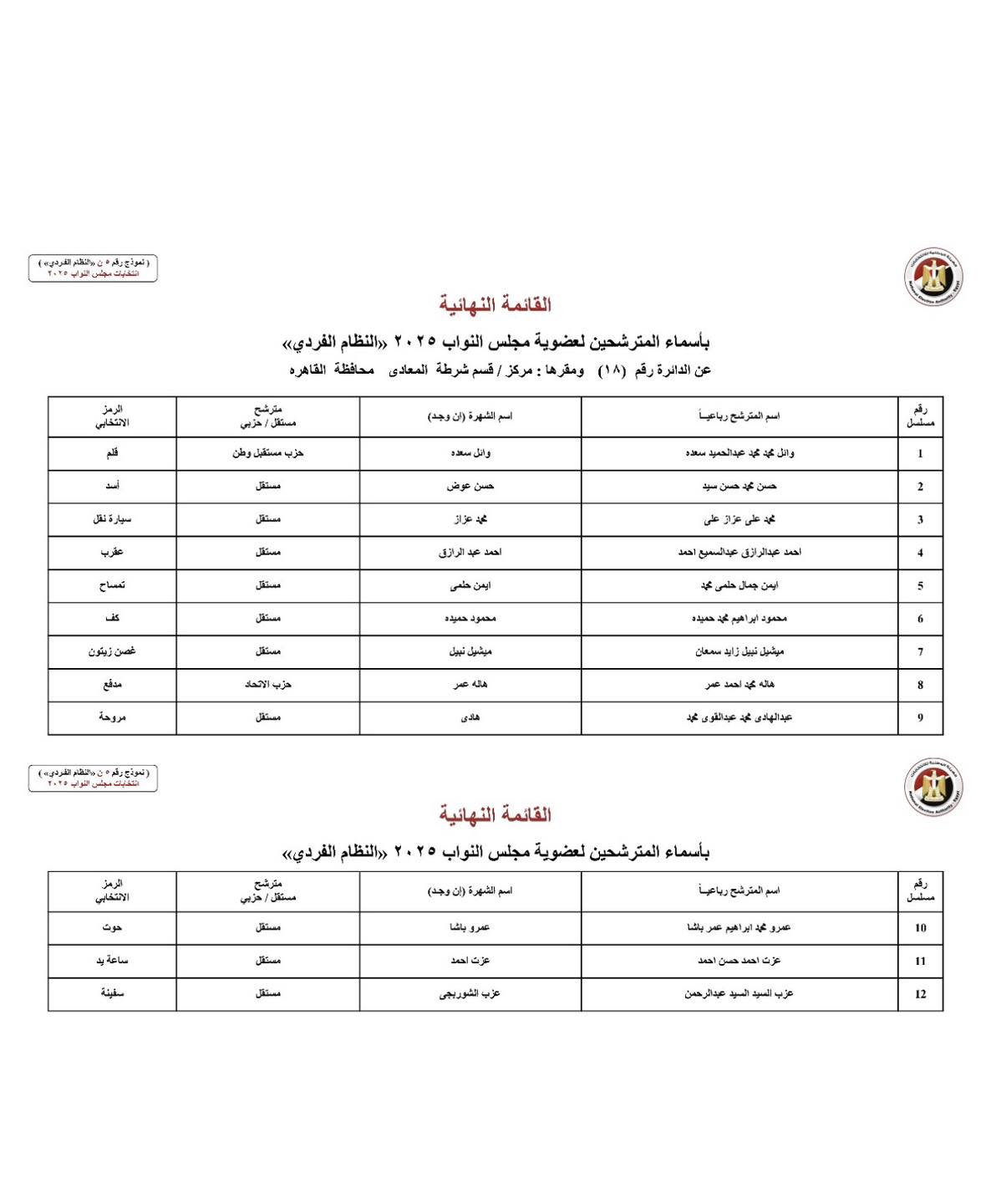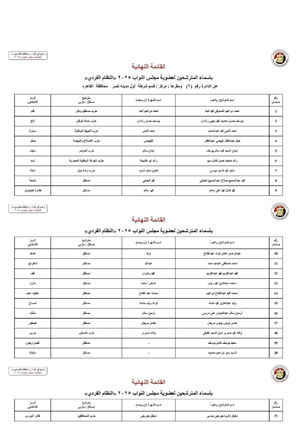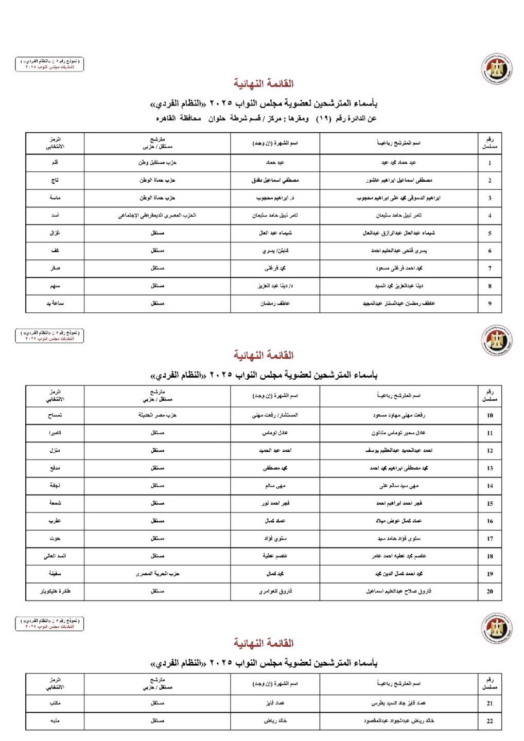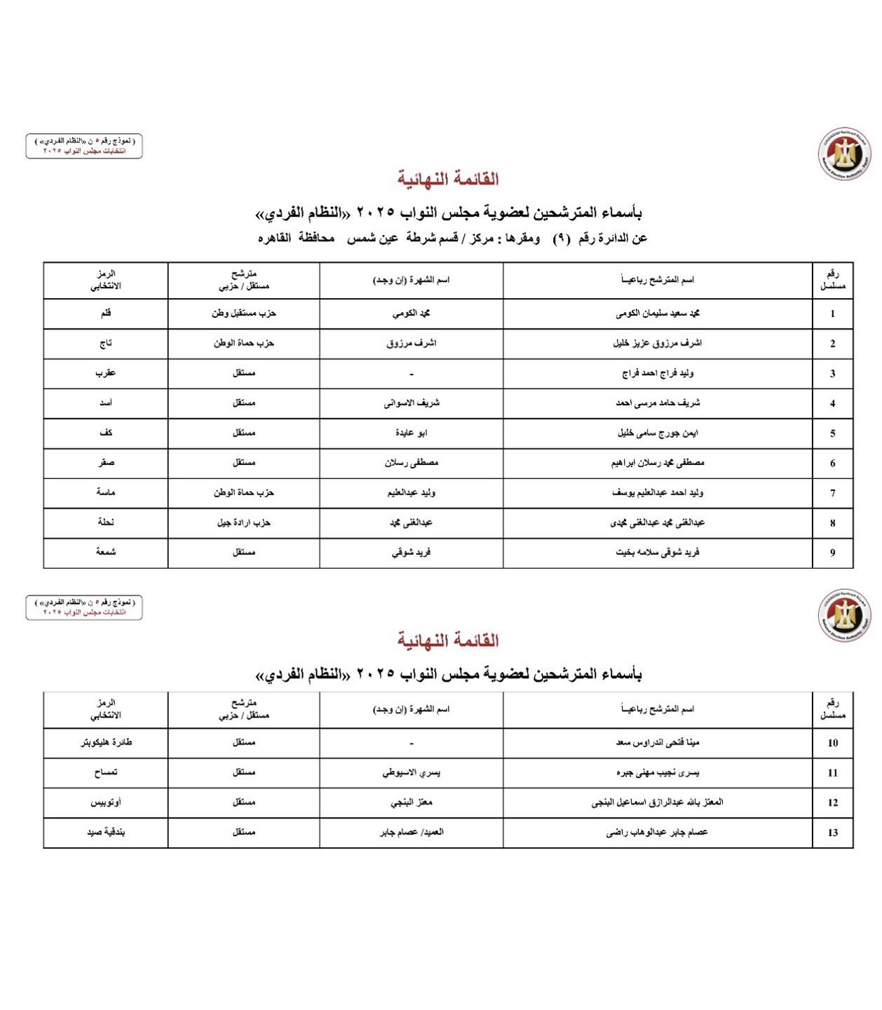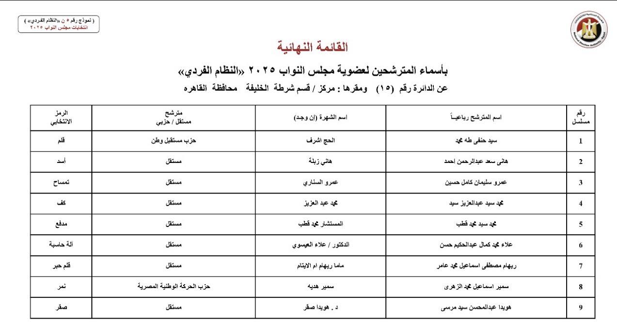 وجاء قرار الهيئة الوطنية للانتخابات برئاسة المستشار حازم بدوي، بإعلان القائمة النهائية للمرشحين، في ضوء انتهاء المدة القانونية المحددة لتقديم الطعون الانتخابية والفصل فيها أمام قضاء مجلس الدولة، سواء الطعون من جانب راغبي الترشح الذين استُبعدوا بمعرفة لجان تلقي وفحص طلبات الترشح، أو من الطاعنين على أسماء بعض المترشحين الواردة أسماؤهم في كشوف القائمة المبدئية.